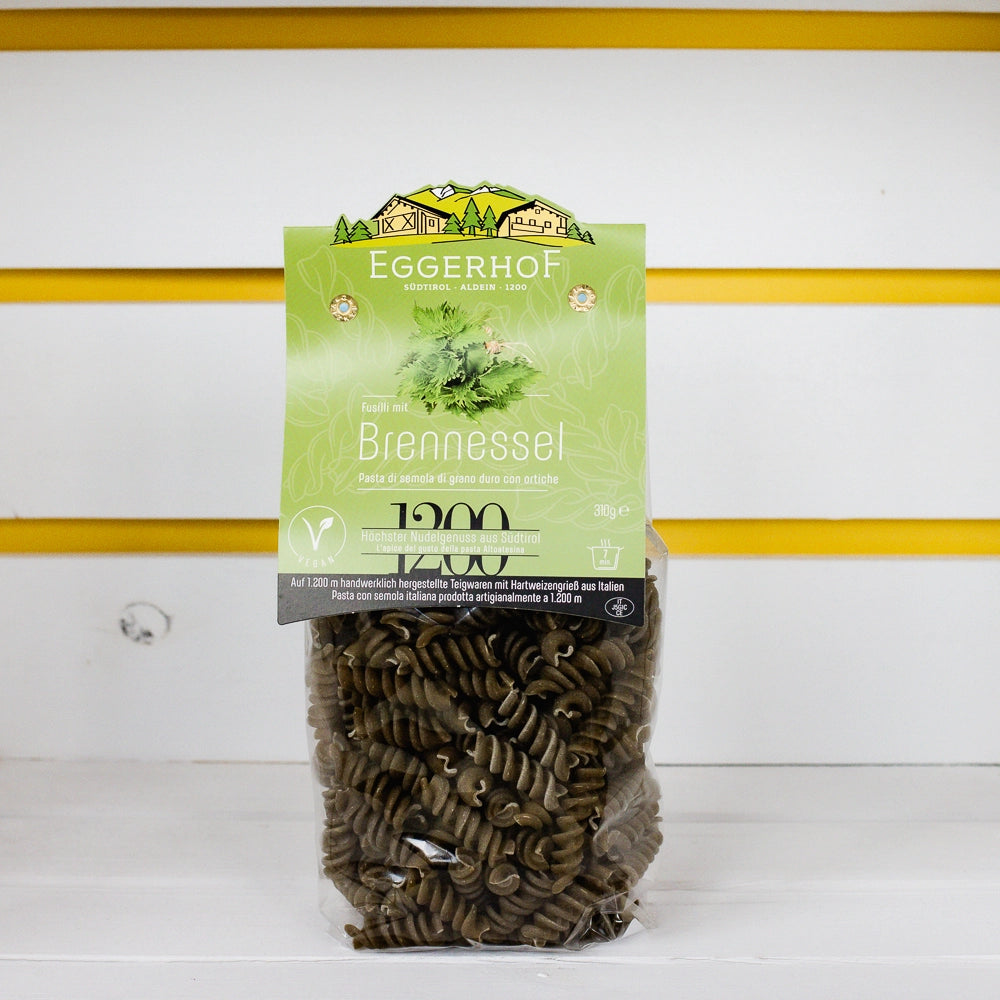 Mit getrockneten Brennnesseln kreieren die Nudelmeister diese köstlichen Spiralnudeln. Die feingehackten Brennnesseln und Minzblätter werden in Handarbeit mit Hartweizengrieß verarbeitet und verleihen den Nudeln ihre einzigartige Farbe. Ein wahrer Genuss! Kochzeit ca. 7 Minuten.