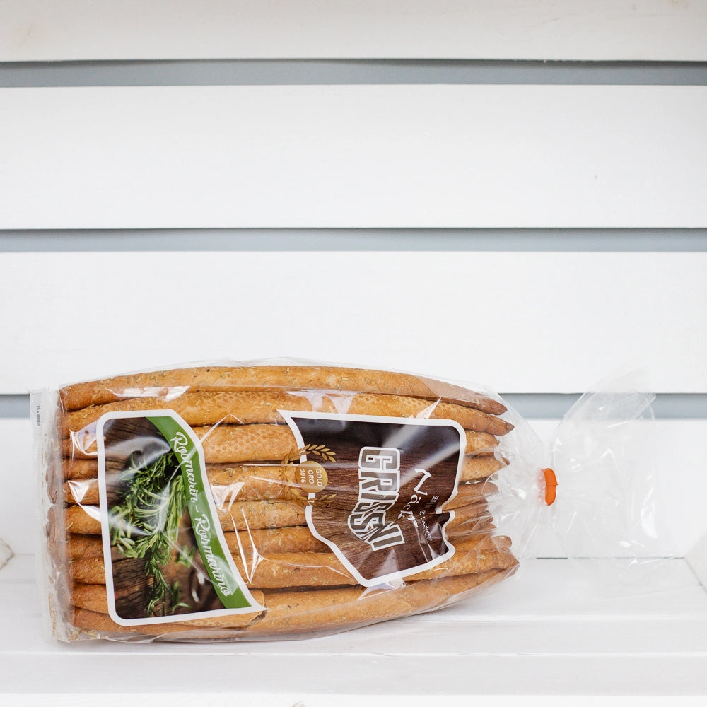 Lang geformte Grissini mit dem Geschmack von Rosmarin. Der beste Snack zu einer italienischen Jause mit Schinken und Käse.
